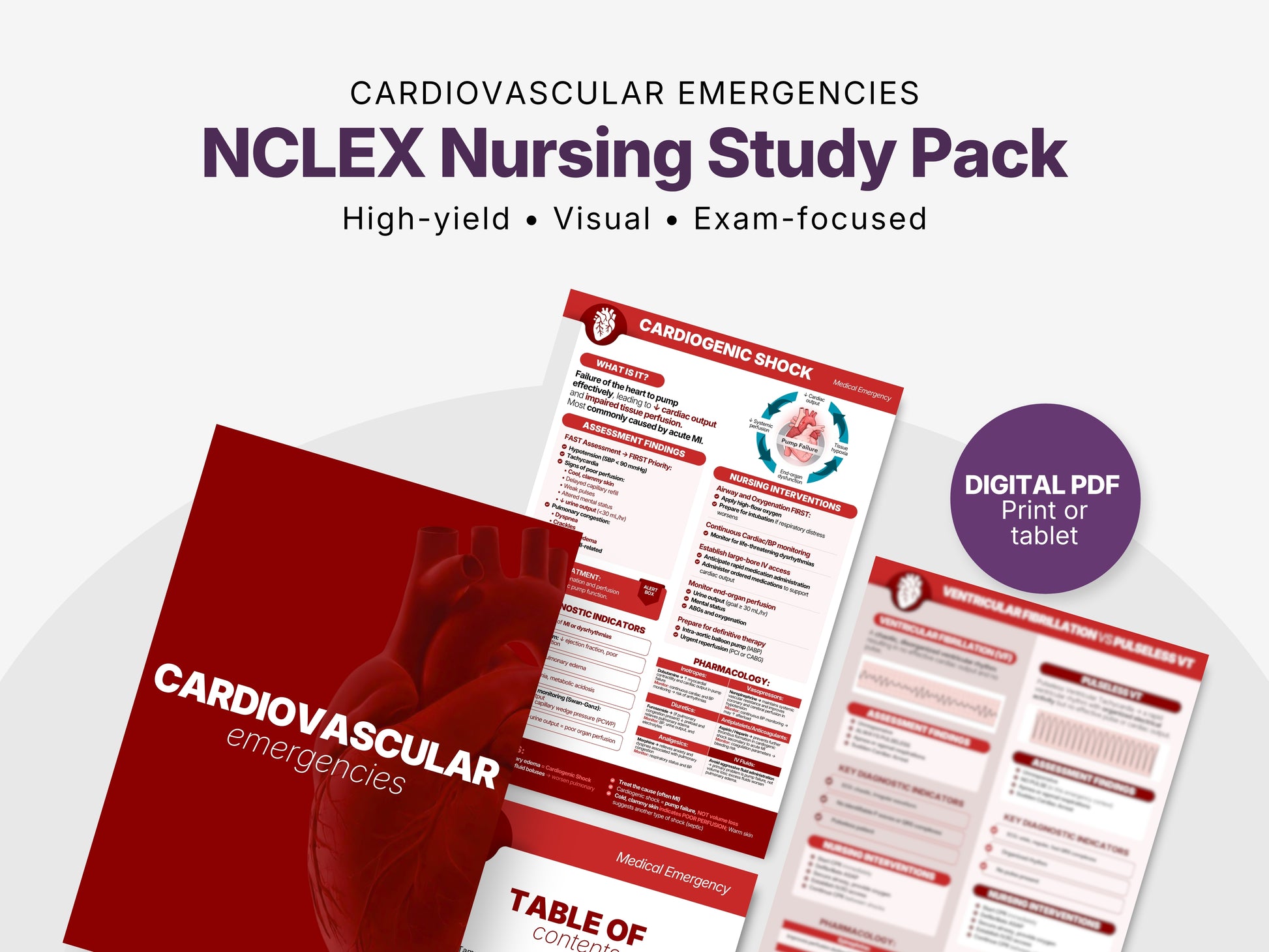 This Cardiovascular Emergencies pack includes simplified nursing references that help you recognize life-threatening conditions quickly and act in the correct priority order.