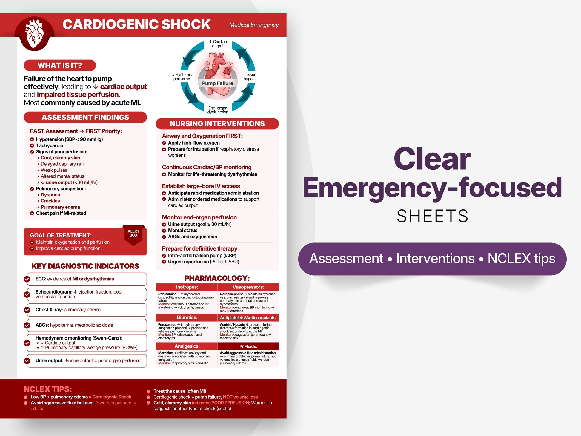 ✔ 10 Cardiovascular emergencies sheets + Bonus high-yield nursing topics